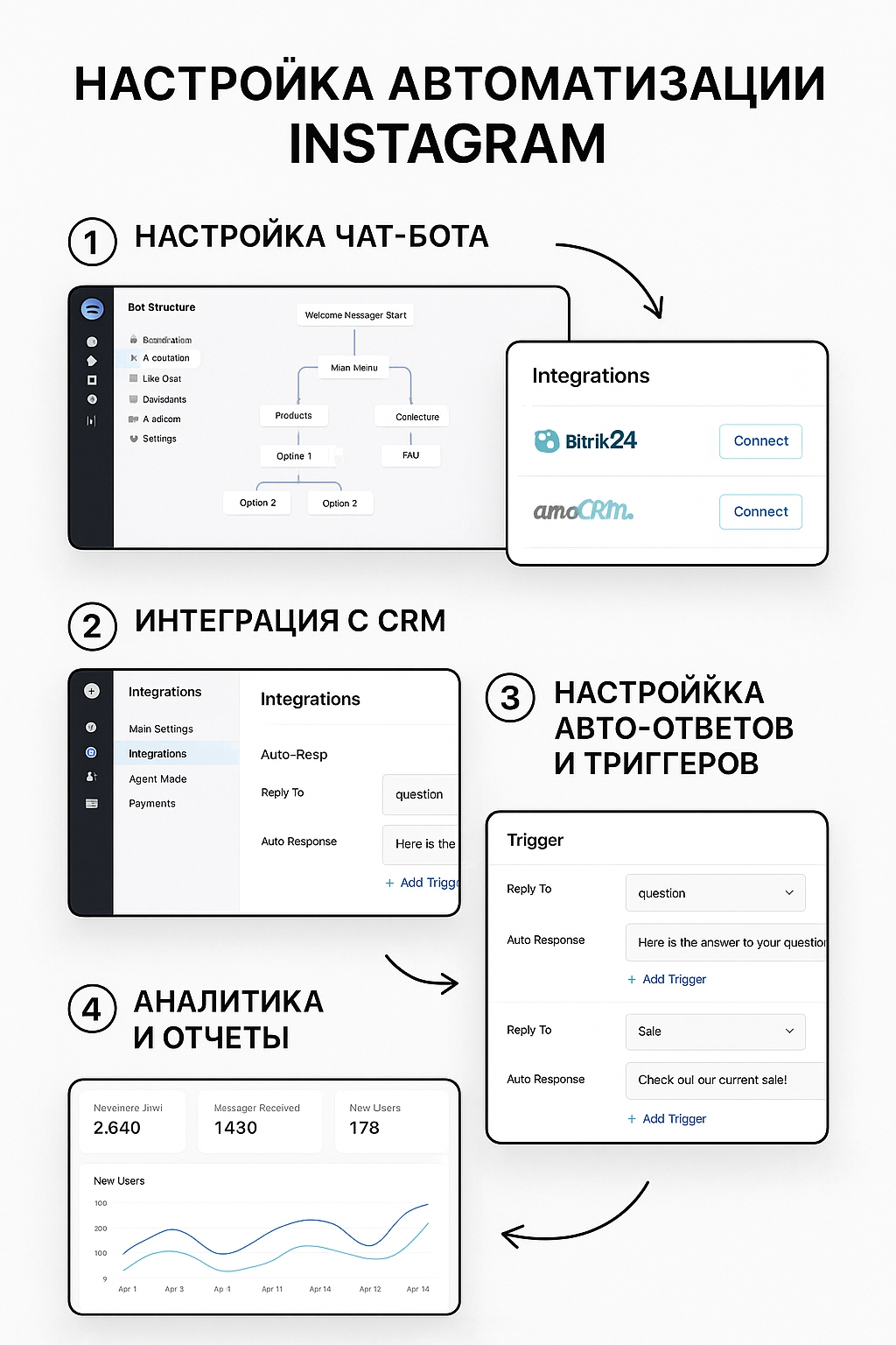 Третий элемент архитектуры — CRM-интеграция, которая обеспечивает синхронизацию данных между Instagram и внешними системами управления клиентами. Все взаимодействия с пользователями автоматически сохраняются в CRM, создавая единую базу данных для последующей работы с клиентами.